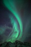 Noorderlicht, poollicht of Aurora Borealis in de nachtelijke hemel boven de Lofoten-eilanden in Noord-Noorwegen. Heldere lichtbundel die oprijst uit de hoge, met sneeuw en ijs bedekte piek op het eiland Austvågøya in de verte.