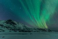 Noorderlicht - Autora Borealis - nachtzicht over de Lofoten-eilanden in Noorwegen tijdens een koude winternacht in het noordpoolgebied. Het poollicht wervelt over een bevroren meer op het eiland Austvågøy.