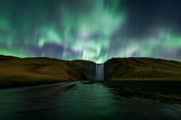 Fel noorderlicht boven 1 van de bekendste watervallen in IJsland, namelijk de Skogafoss. De Skogafoss is een 60 meter hoge waterval in het dorp Skogar.