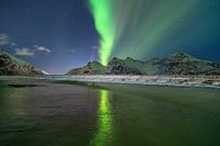 Noorderlicht boven het strand van Skaksanden en de bergen op de Lofoten, Noorwegen.