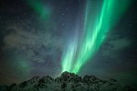 Noorderlicht, poollicht of Aurora Borealis in de nachtelijke hemel boven de Lofoten-eilanden in Noord-Noorwegen. Heldere lichtbundel die oprijst uit de hoge, met sneeuw en ijs bedekte piek op het eiland Austvågøya in de verte.