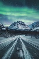 Dit indrukwekkende landschap toont een besneeuwde weg die door een majestueuze bergketen loopt. Groene poollichtjes dansen boven de toppen aan de nachtelijke hemel, terwijl fonkelende sterren het tafereel verlichten. De combinatie van winterse stilte en indrukwekkende natuur creëert een fascinerende, bijna mystieke sfeer.
