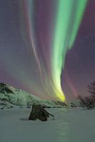 Aurora Borealis, Noorderlicht of Poollicht in de donkere nachtelijke hemel boven de Lofoten-archipel in Noord-Noorwegen tijdens een koude winternacht. In de wintermaanden worden de Lofoten-eilanden in Noorwegen een van de beste podia voor een van de meest spectaculaire fenomenen van de natuur - het noorderlicht, ook wel aurora borealis genoemd. Deze dans van lichtjes, die steeds verandert, werpt een buitenaardse gloed over de ruige, met vorst bedekte wildernis van de Lofoten. De verlichting brengt de landschappen tot leven, de silhouetten van de bergen dramatischer, de witte sneeuw fonkelend alsof ze met sterrenstof is bestrooid, de ijzige fjorden als kristallen platen onder het mystieke licht.