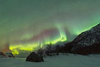 Aurora Borealis, Noorderlicht of Poollicht in de donkere nachtelijke hemel boven de Lofoten-archipel in Noord-Noorwegen tijdens een koude winternacht. In de wintermaanden worden de Lofoten-eilanden in Noorwegen een van de beste podia voor een van de meest spectaculaire fenomenen van de natuur - het noorderlicht, ook wel aurora borealis genoemd. Deze dans van lichtjes, die steeds verandert, werpt een buitenaardse gloed over de ruige, met vorst bedekte wildernis van de Lofoten. De verlichting brengt de landschappen tot leven, de silhouetten van de bergen dramatischer, de witte sneeuw fonkelend alsof ze met sterrenstof is bestrooid, de ijzige fjorden als kristallen platen onder het mystieke licht.