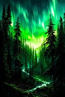 Dit adembenemende kunstwerk vangt de magie van het noorderlicht boven een dichtbegroeid bos. De heldergroene tinten dansen door de lucht en reflecteren op een kabbelend beekje dat door het landschap stroomt. Het contrast tussen de donkere silhouetten van de bomen en het stralende licht creëert een mystieke, bijna surrealistische sfeer. Perfect voor wie houdt van de natuur en de betovering van het poollicht. Dit ontwerp past uitstekend in moderne interieurs en voegt een vleugje magie toe aan elke ruimte. Of het nu in de slaapkamer, eetkamer of kantoor wordt geplaatst, dit kunstwerk brengt rust en inspiratie.