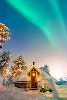 Een traditionele Sami Kotta in Fins Lapland onder een heldere sterrenhemel met Noorderlicht.