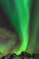 Noorderlicht, poollicht of Aurora Borealis in de nachtelijke hemel boven de Lofoten-eilanden in Noord-Noorwegen. Heldere lichtbundel die oprijst uit de hoge sneeuw en met ijs bedekte toppen in de verte.