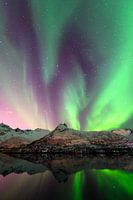 Noorderlicht, poollicht of Aurora Borealis in de nachtelijke hemel boven de Lofoten eilanden in Noord-Noorwegen. Breed panoramisch beeld met sneeuw bedekte bergen en een meer op de voorgrond.
