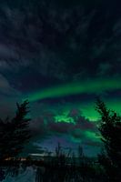 Noorderlicht, poollicht of Aurora Borealis in de nachtelijke hemel boven Senja eiland in Noord-Noorwegen door de pijnbomen met wat wolken in de lucht.