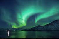 Noorderlicht boven de fjorden van Noord-Noorwegen tijdens een indrukwekkende avond vol Aurora activiteit.