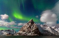 De Lofoten eilanden liggen in noord Noorwegen, ver boven de Poolcirkel. In de wintermaanden bij helder weer kun je Aurora Borealis waarnemen. Hier zien we dat achter de berg Olstinden in Reine.