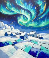 De foto toont een fascinerend tafereel: het noorderlicht danst boven een pittoresk, met sneeuw bedekt dorpje. De heldere kleuren van het noorderlicht vormen een prachtig contrast met het vredige, witte landschap.