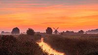 Een sfeervolle zomerse zonsopkomst met warme kleurtinten in de lucht bij de Noordermolen, gelegen in Noorddijk net buiten de stad Groningen.