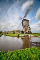 Sfeervolle, schilderachtige avondopname van de Noord-Brabantse Noordeveldse watermolen (wipmolen). De mooie molen met de weerspiegeling in het water en de Hollandse lucht, maakt dit een typisch Hollands plaatje.