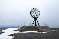 Noordkaap monument op het noordelijkste puntje van het europese vasteland. Op de achtergrond de Barentszzee.