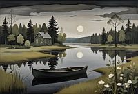 ijzig meer met een huis en een boot, noordelijk moerasland