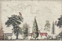Nostalgische illustratie met oude kaart, bomen, herten en uilen