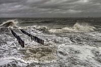 Aan de panoramaweg te Groede. Een Noordwesterstorm veroorzaakt een mooi ruwe branding. Er blijven voornamelijk grijstinten over, wat het geheel dreigend maakt.