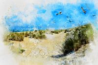 Duinen en meeuwen aan de Noordzee in Nederland in digitale aquarel