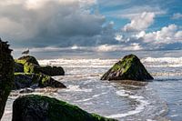 Een dynamische kustscène waarin de onstuitbare energie van de zee en de kalmte van het moment samenkomen. Ruwe, met mos beklede rotsen nemen de voorgrond in, terwijl de branding onophoudelijk tegen de kust slaat en schuim en spatten in beweging brengt.