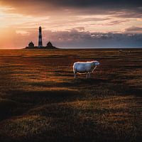 De ondergaande zon baadt het landschap rond de vuurtoren van Westerheversand in een gouden licht. Een schaap lijkt van het moment te genieten.