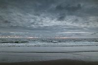 Landschap van de ruige zee net na zonsondergang. De Nederlandse kust met haar wind die de wolken langzaam verplaatst en de golven in beweging brengt.