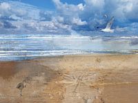 Een artistieke bewerking van een Nederlands noordzeestrand. Vooral de frisse en beweeglijke, ietwat winderige, indruk maken het typisch noordzee en atlantische kust.