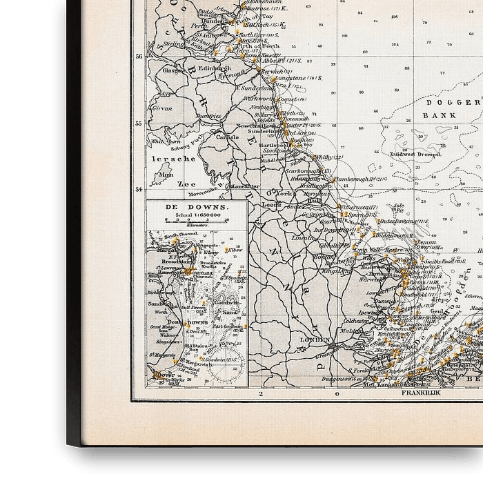 Op deze antieke zeekaart uit ca. 1900 staat de Noordzee afgebeeld. De diepte wordt aangegeven met dieptelijnen en getallen in de kaart.