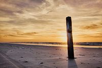 Een beeld van het Noordzeestrand bij een zonsondergang met op de voorgrond een strandpaal