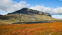 De herfst is begonnen de warme kleuren hoog op de berg geven een schitterend gezicht. Noorwegen een land waar de natuur extreem mooi is, ongerept en puur. Blauwe lucht, witte wolken en de warm oranje tinten geven een natuurlijk kleurrijk beeld aan uw muur.