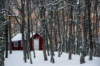 Zonsopkomst achter een Noors hutje in een besneeuwd bos in Evenes, vlakbij de Vesterålen en Lofoten in Noorwegen.