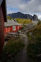 Rode huisjes en bergen in de achtergrond, gras op de daken en graniet dat zich hier en daar door de beplanting laat zien.