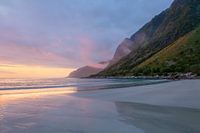 Het is midden in de nacht en met behulp van deze afbeelding bevinden we ons op een Noors midzomernacht strand. Het zal niet donker worden vannacht. De zon staat net buiten beeld heel laag aan de horizon en zorgt voor een gouden weerspiegeling op het natte strand. Onze aandacht wordt getrokken door de optrekkende mistflarden met een roze…