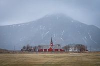 Typische Noorse bouwstijl die je veel op Lofoten ziet met die prachtige rode kleur. Een mooi kerkje wat goed afsteekt tegen de imposante donkere beetje besneeuwde berg op de achtergrond.