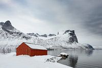 Panoramisch uitzicht op het eiland Senja in Noord-Noorwegen tijdens een koude winterdag. De gronden en bergen zijn bedekt met sneeuw onder een donkere stormachtige lucht. Er is een typische Noorse rode schuur aan de kust van de Fjord.