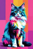 De Noorse Boskat in pop-art barst van de levendige kleuren en gedurfde patronen, die zijn majestueuze kenmerken vastleggen. Met zijn weelderige vacht, pluimpjes op de oren en opvallende groene ogen is de kat afgebeeld in een speelse, abstracte stijl. De speelse juxtapositie van vormen en tinten weerspiegelt de temperamentvolle aard van het ras en viert zijn schoonheid en charme op een moderne artistieke manier.