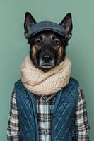 Een fascinerende Noorse elandhond wordt hier gepresenteerd in een stijlvolle outfit: met een elegante hoed, een knusse sjaal en een modieus vest. Zijn aandachtige blik straalt zelfvertrouwen uit, terwijl de combinatie van bont en textiel een harmonieuze combinatie van natuur en menselijkheid benadrukt. Een echte charmeur die zowel stijl…