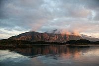 Wolken en berg kleuren roze door de zonsondergang. Bergen en wolken reflecteren in het meer.