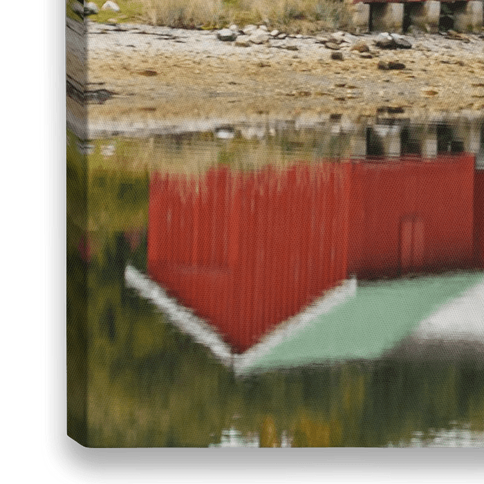 De Noorse boothuisjes langs een fjord. geschilderd in de bekende Scandinavische kleuren. De weerspiegeling in het water en de prachtige herfstkleuren maken het geheel compleet.