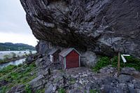 Onder een grote rots-overhang (de betekenis van "helleren" is overhangende rots) aan het eind van het Jøssingfjord staan deze 2 huisjes uit begin 19e eeuw.