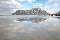 Besneeuwde bergen, weerspiegeling op het Strand van Skagsanden.