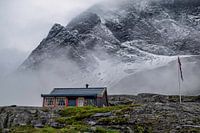 De foto "Noorwegen, de top van de Trollstigen" legt een betoverend tafereel vast op de top van de beroemde helling genaamd de "Trollstigen" in Noorwegen. Het huisje met de trotse Noorse vlag staat majestueus voor een imposante en ruige bergtop, waarbij de contrasten tussen de natuurlijke elementen opvallen.
