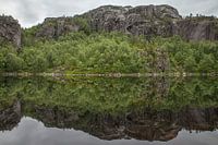 Noorwegen met een mooi landschap van een meer waarin de bergen weerspiegelen. Dit is het meer van Skogavatnet in de buurt van het Lysefjord. De natuur is er wild en heel mooi. Het fjord ligt in het zuiden van Noorwegen, Scandinavië.