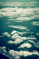 Luchtfoto van een vliegtuig dat hoog over de besneeuwde bergen in Noord-Noorwegen vliegt tijdens een mooie winterdag.