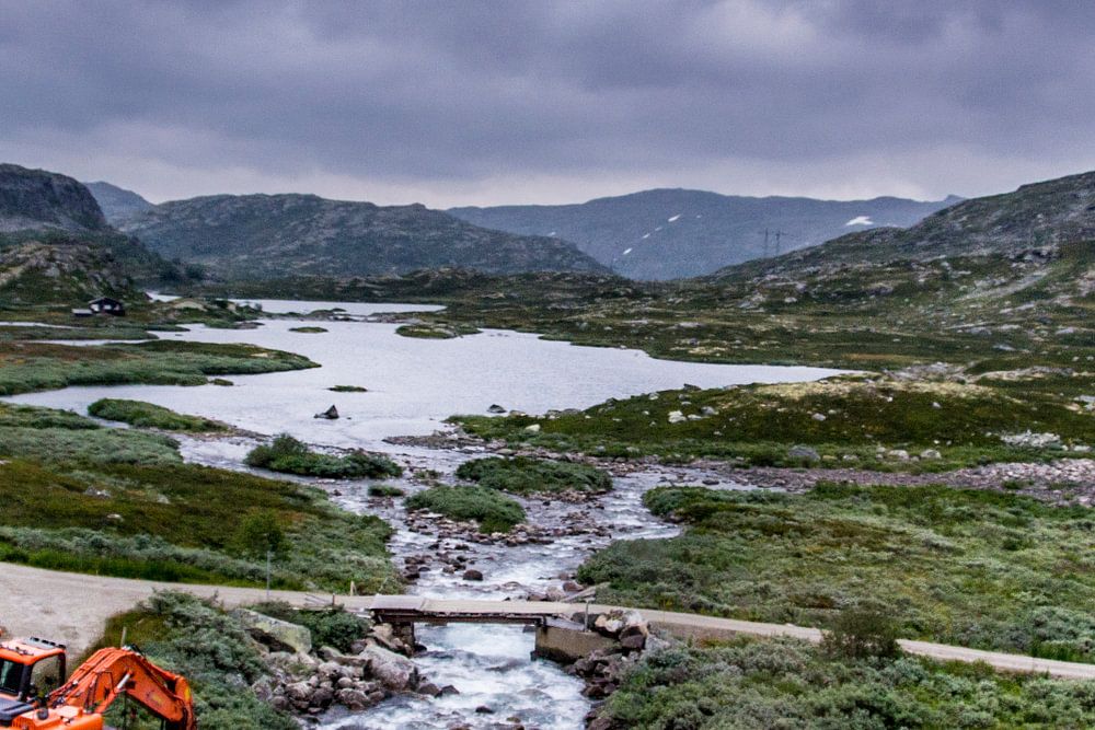 Vanuit de trein een prachtig uitzicht gehad op de wilde natuur van Noorwegen. Hier een beekje met spoor van de mens, een graafwagen.