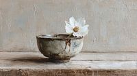 Zachte, minimalistische bloemencompositie die Japanse esthetiek combineert met rustige natuurlijke tinten, eenvoudige vormen en uitgebalanceerde negatieve ruimte, waardoor een serene, moderne en tijdloze botanische harmonie ontstaat.