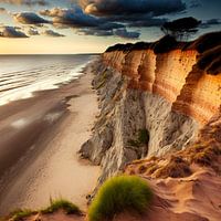 Deze prachtige foto in National Geographic-stijl legt de adembenemende schoonheid van de Normandische kust bij zonsondergang vast. Torenhoge witte kliffen steken af tegen het licht van het gouden uur, terwijl winderige zandduinen bedekt zijn met weelderig groen gras. Zacht zand drijft neer vanaf de kliffen terwijl dramatische wolken…