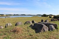 Gezicht op de neolithische Long barrow-stenen en het omringende landschap bij Norreballe Nor bij Humble, Langeland, Denemarken. Zomerlandschap reisfotografie.