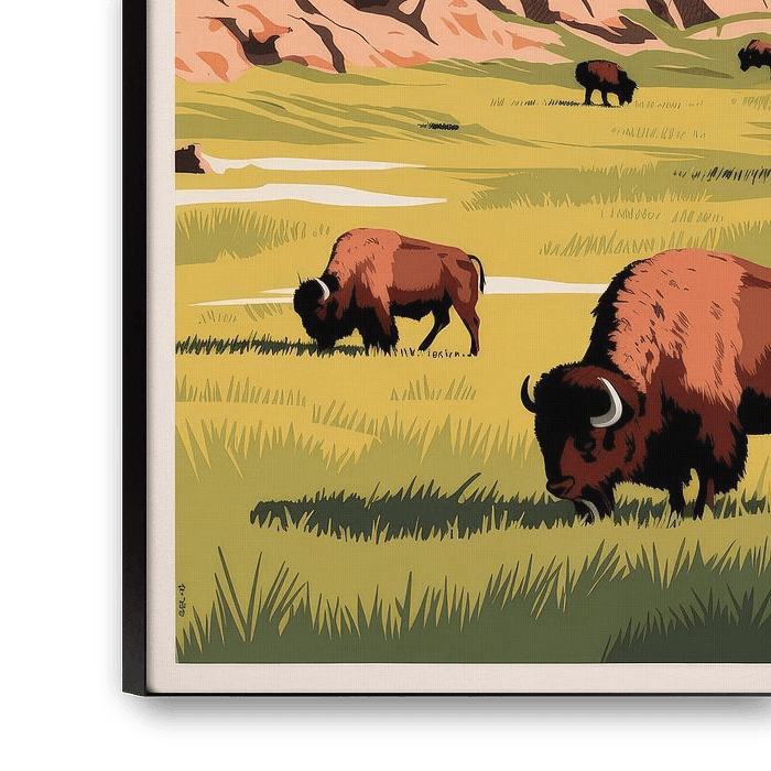 Woeste vlaktes en indrukwekkende bergen geven de charme van North Dakota weer. De glooiende heuvels en majestueuze bizons vertellen verhalen van ongerepte natuur. Deze levendige afbeelding brengt een gevoel van vrijheid in elke woonkamer, waar het je uitnodigt om te ontspannen en te dagdromen. Perfect voor natuurliefhebbers en avonturiers!