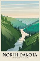 Een rustige rivier kronkelt door het weelderige, groene landschap van North Dakota, terwijl glooiende heuvels in de verte vervagen. Het harmonieuze kleurenpalet en de minimalistische lijnen geven het kunstwerk een tijdloze elegantie. Het is perfect voor de woonkamer en nodigt je uit om je blik te laten dwalen en te genieten van de rust van de natuur.
